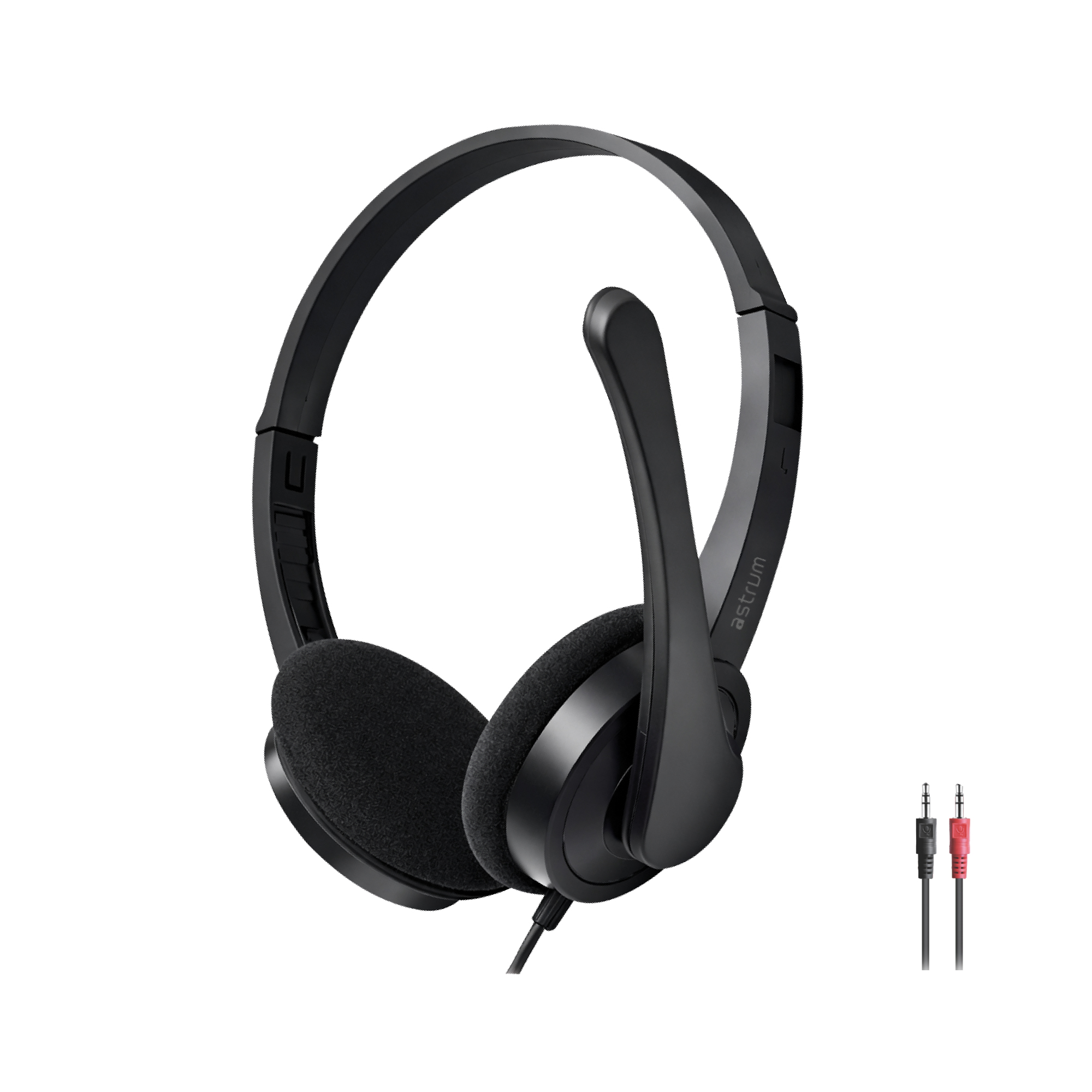 The Astrum HS240 is a lightweight, wired over-ear headset designed for clear communication and everyday use, featuring dual 3.5mm AUX plugs and a flexible boom microphone.