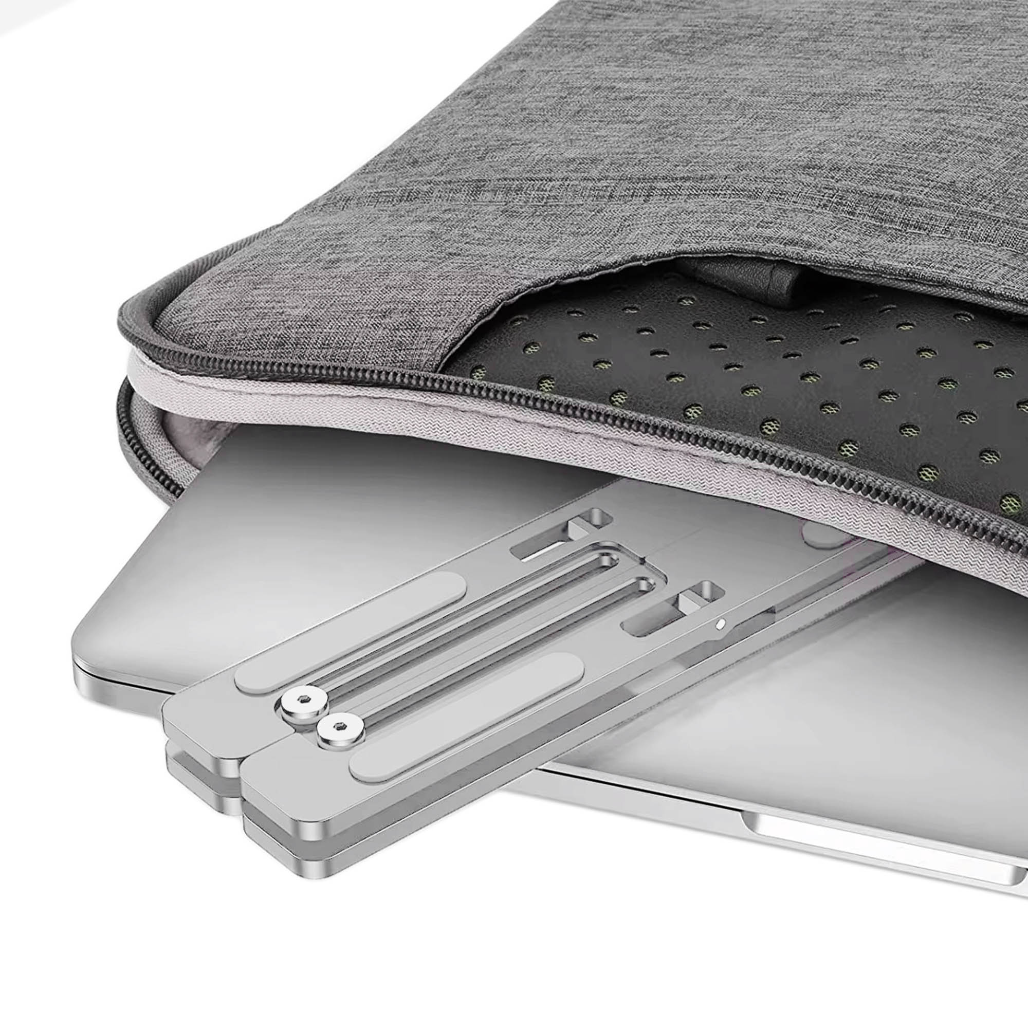 Foldable aluminum laptop/tablet stand with ultralight chassis, silicone cushions, feet, and expandable design.